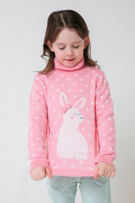 Нежно-розовый джемпер с высоким горлом. Высокий воротник защитит шею от ветра и холодного воздуха. Украшен вывязанным узором в горошек и изображением белого зайки на полочке. На голове зайчика объёмный вязаный бантик. Манжеты и пояс связаны ластиком.Дополнительно