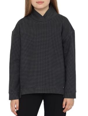 Трикотажный детский джемпер для девочек из набивного футера - имитирует костюмную ткань, с воротником-стойкой. Свитшот имеет спущенные рукава и свободный силуэт. Боковые швы переходят на перед. На рукавах и снизу толстовка отделана манжетами и поясом из основного полотна. Спереди декоративный металлический лейбл.Дополнительно