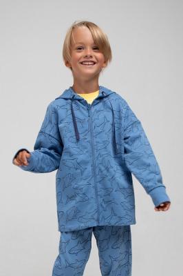 Куртка с тонким капюшоном. Сшита из набивного трикотажа футер петля с изображением акул. Застёгивается на тракторную молнию. Капюшон утягивается с помощью ленты. Длинные рукава со спущенными плечами оканчиваются эластичными манжетами. По бокам два удобных кармана. Удлинённая закруглённая спинка и низ изделия обработаны плоскими швами.Дополнительно