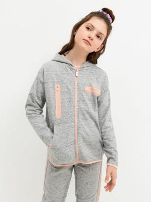 Толстовка серого цвета с контрастными вставками нежно-розового цвета для девочек. Сшита из смесового органического хлопка. Это дышащий, износоустойчивый и приятный к телу материал, который обеспечивает комфорт во время носки. Петельная изнанка. Капюшон на подкладке, прорезной карман на молнии и два накладных кармана спереди. Центральная застежка на молнию. Лаконичный текстовый принт.Дополнительно