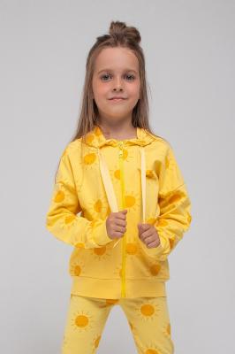 Куртка с двойным капюшоном. Внутри капюшона хлопковый подклад. Сшита из набивного трикотажа футер петля с изображением солнышек. Застёгивается на тракторную молнию. Капюшон утягивается с помощью ленты. Длинные рукава оканчиваются эластичными манжетами. Внизу мягкий пояс. По бокам два удобных кармана.Дополнительно