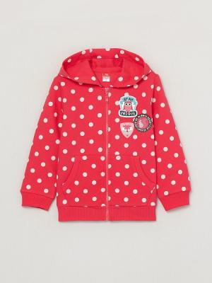 Толстовка для девочки с капюшоном и центральной застежкой переда на замок-молнию и карманами-кенгуру. Капюшон без подкладки. Рукава длинные, с манжетами по низу. Нижние срезы переда и спинки обработаны притачным поясом. На левую полочку настрочены декоративные жаккардовые этикетки.Дополнительно