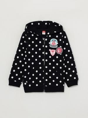 Толстовка для девочки с капюшоном и центральной застежкой переда на замок-молнию и карманами-кенгуру. Капюшон без подкладки. Рукава длинные, с манжетами по низу. Нижние срезы переда и спинки обработаны притачным поясом. На левую полочку настрочены декоративные жаккардовые этикетки.Дополнительно