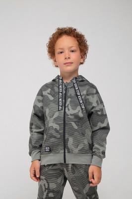 Куртка с тонким капюшоном из петельчатого футера с набивным рисунком. Капюшон утягивается с помощью ленты. Застёгивается на молнию. Длинные рукава со спущенными плечами придают свободный объём. Мягкие пояс и манжеты выполнены из эластичного материала с добавлением лайкры. Впереди удобные карманы. Украшена жаккардовой нашивкой.Дополнительно