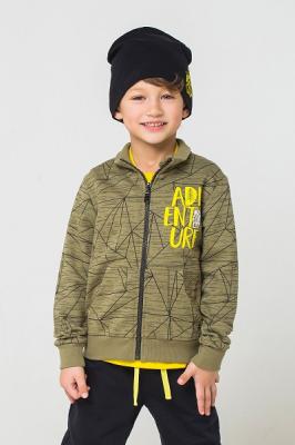 Толстовка для мальчика из футера с набивным рисунком. Воротник-стойка, манжеты и пояс из хлопка с эластаном. Длинные рукава. Застежка на тракторную молнию с защитой для подбородка. Спереди карман кенгуру с контрастными закрепками, принт.Дополнительно
