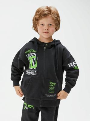Детская толстовка оверсайз с капюшоном для мальчика выполнена из мягкого футера с начесом, что обеспечивает комфорт и тепло во время ношения. Застежка на тесьму-молнию облегчает одевание. Модель посадки оверсайз позволяет создавать стильные многослойные образы. Два боковых кармана добавляют худи практичности. Капюшон регулируется шнуром. Спереди расположен текстовый принт "START NOW | NO BAD DAYS ANYMORE | I'M ROLLING IN THE GOOD MOMENTS | CHOOSE FUN | A FRESH ADVENTURE | ALWAYS EXPLORE | ADVENTURE IS OUT THERE | GO OUTDOOR CAMPING" англ. - "Начни сейчас | Больше никаких плохих дней | Я наслаждаюсь хорошими моментами | Выбирай веселье | Свежее приключение | Всегда исследуй | Приключения где-то | Отправляйся в поход", что придает изделию акцент. На рукаве также расположен принт "READY TO EXPLORE" англ. - "Будь готов к исследованию". Низ изделия и манжеты выполнены из рибового полотна, которое обеспечивает лучшее прилегание к телу.Дополнительно