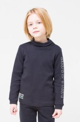Однотонная водолазка для мальчика из хлопкового трикотажа интерлок. Длинные рукава с манжетами. Высокая горловина с отворотом. В области плеча предусмотрена застежка на кнопки-ободок. Спереди и на рукаве принты.Дополнительно