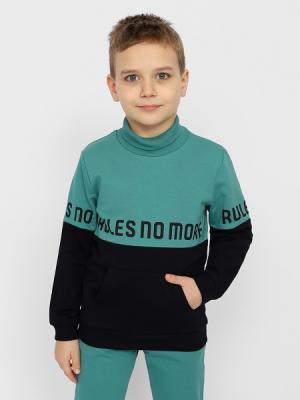 Водолазка для мальчика комбинированная с воротником стойкой с отворотом. Рукава длинные, с манжетами. Нижние срезы водолазки оформлены притачным эластичным поясом. На нижней части полочки обработан накладной карман "кенгуру". Перед и рукава водолазки декорированы принтом.Дополнительно