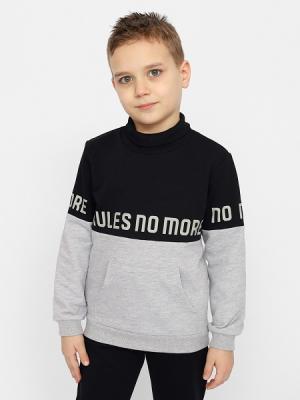 Водолазка для мальчика комбинированная с воротником стойкой с отворотом. Рукава длинные, с манжетами. Нижние срезы водолазки оформлены притачным эластичным поясом. На нижней части полочки обработан накладной карман "кенгуру". Перед и рукава водолазки декорированы принтом.Дополнительно