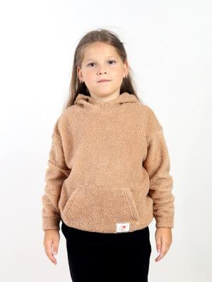 Толстовка для девочки из мягкого искусственного меха. Нежная, уютная и очень теплая толстовка из трикотажного полотна с эффектом меха ягнёнка. Крой оверсайз с заниженной линией плеча не сковывает движения, позволяя ребенку быть активным. Модель дополнена капюшоном и длинными рукавами. Спереди накладной карман кенгуру. Декорирована нашивной этикеткой.Дополнительно