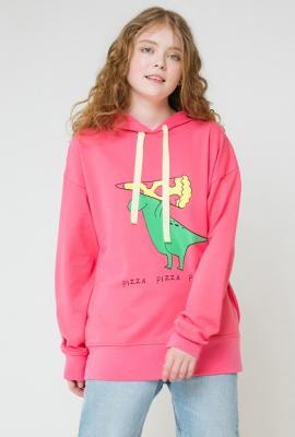 Толстовка с капюшоном из однотонного футера петли. Капюшон утягивается при помощи ленты. По бокам удобные карманы. На рукавах - эластичные манжеты. Внизу - мягкий пояс. Украшена принтом с изображением динозавара и кусочка пиццы.Дополнительно