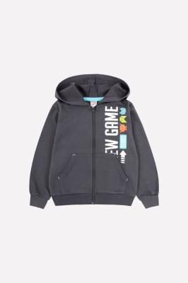 Толстовка с капюшоном из однотонного футера-петли. Длинные рукава. Эластичные пояс и манжеты. Застежка на тракторную молнию, карман-кенгуру. Спереди и на спинке принты.Дополнительно