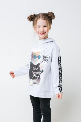 Тёплый джемпер с начёсом с капюшоном без подклада. Украшен принтом на полочке и лентами с принтом на рукавах. Спущенные плечи придают свободный объём. Внизу - мягкий пояс.Дополнительно