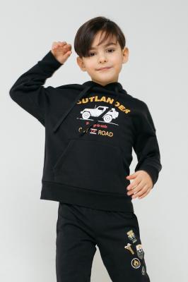 Тёплая толстовка из футера с начёсом. Капюшон утягивается с помощью ленты. На животе - удобный карман-кенгуру. На рукавах - эластичные манжеты. Внизу - мягкий пояс. Украшена крупным принтом на полочке.Дополнительно