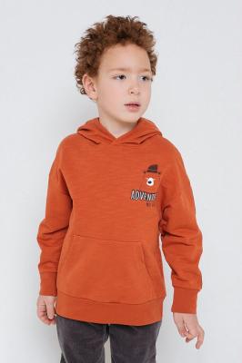 Джемпер из петельчатого футера с эффектом слаб. Спущенные плечи создают свободный силуэт. Капюшон с мягим подкладом из супрема. На животе вместительный карман-кенгуру. Манжеты и пояс выполнены из мягкого эластичного материала рибана с лайкрой. Украшен принтом на груди и широкими лентами с принтом на рукавах.Дополнительно