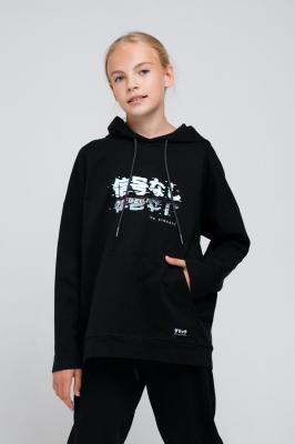 Толстовка оверсайз с капюшоном. Сшита из футера петли. Капюшон с мягким хлопковым подкладом утягивается с помощью шнурка. Рукава со спущенными плечами по низу обработаны плоскими швами. Внизу мягкий пояс. Украшена принтом. На животе вместительный карман-кенгуру с жаккардовой нашивкой.Дополнительно