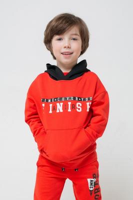 Джемпер из однотонного футера петли ярко-красного цвета с чёрным капюшоном. Спущенные плечи создают свободный силуэт. На животе - удобный карман-кенгуру. На рукавах - эластичные манжеты. Внизу - мягкий пояс. Украшен принтом на полочке.Дополнительно