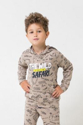 Светло-коричневый джемпер из петельчатого футера с капюшоном без подклада. Украшен набивным рисунком и принтом на груди. Накладной карман-кенгуру. Пояс и манжеты из основного материала.Дополнительно