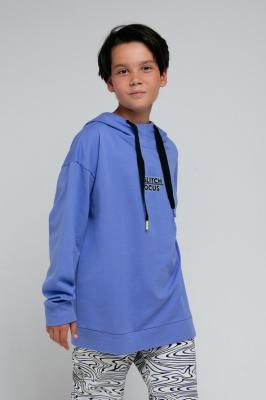 Толстовка с капюшоном для мальчика. Сшита из хлопкового трикотажа футер петля. Капюшон с подкладом из супрема утягивается с помощью ленты. Рукава со спущенными плечами оканчиваются манжетами. Пояс выполнен из эластичного материала с добавлением лайкры. Украшена принтом на груди и жаккардовой нашивкой.Дополнительно