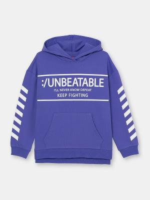 Толстовка для мальчика с капюшоном и карманом "кенгуру". Рукава длинные, с манжетами. Нижние срезы толстовки обработаны притачным поясом. Манжеты и пояс выполнены из полотна с эластаном. В боковых швах снизу обработаны разрезы. Гладкоокрашенные варианты декорированы принтами по переду и рукавам.Дополнительно
