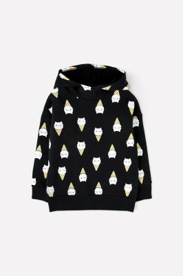 Тёплый джемпер с начёсом с капюшоном без подклада. Украшен набивным принтом. Спущенные плечи придают свободный объём. На рукавах - эластичные манжеты. Внизу - мягкий пояс.Дополнительно