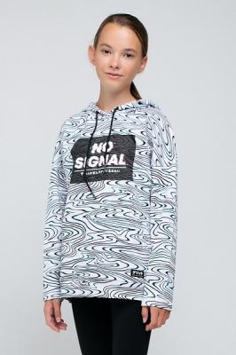 Толстовка оверсайз с капюшоном. Сшита из футера петли. Капюшон с мягким хлопковым подкладом утягивается с помощью шнурка. Рукава со спущенными плечами по низу обработаны плоскими швами. Внизу мягкий пояс. Украшена принтом и набивным рисунком. На животе вместительный карман-кенгуру с жаккардовой нашивкой.Дополнительно