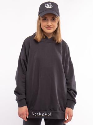 Худи для девочки в графитовой расцветке с капюшоном. Стильное оверсайзное худи из футера с карманами. По нижнему краю объемная вышивка Rock&Roll. Манжеты рукавов и низ на резинке.Дополнительно
