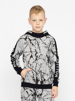 Толстовка для мальчика с капюшоном. Капюшон с подкладкой и декоративными элементами спереди из шнура. Рукава "реглан" со вставками и принтами. Перед толстовки с треугольными боковыми вставками, в швах притачивания которых обработаны карманы. В области груди спереди настрочена декоративная жаккардовая этикетка.Дополнительно