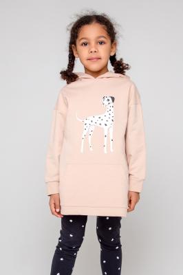 Удлинённая толстовка с капюшоном. Сшита из плотного футера петли трёхнитки. Рукава со спущенными плечами оканчиваются эластичными манжетами и придают свободный объём. На животе большой удобный карман-кенгуру. Низ обработан плоскими швами. Украшена изображением далматинца.Дополнительно