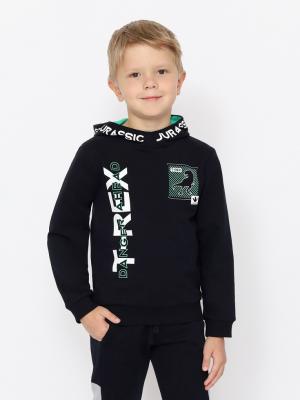 Толстовка с длинными рукавами, притачным поясом и манжетами. Манжеты и пояс выполненя из полотна с добавлением эластана. Капюшон с притачной планкой и подкладкой контрастного цвета, планка декорирована принтом. Перед декорирован принтом "тираннозавр Рекс".Дополнительно