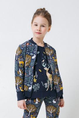 Тёплая куртка-бомбер с начёсом. Застёгивается на молнию. По бокам два кармана. На рукавах - эластичные манжеты, внизу - мягкий пояс. Украшена набивным рисунком.Дополнительно
