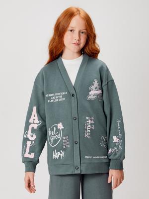 Жакет на кнопках для девочки. Модель посадки comfort изготовлена из футера с петлями на изнанке (без начёса). Прямой свободный силуэт, приспущенная линия плеча, чуть увеличенный объём рукава. По низу рукавов расположены эластичные манжеты из рибового трикотажа. Спереди и на спинке текстовые принты.Дополнительно