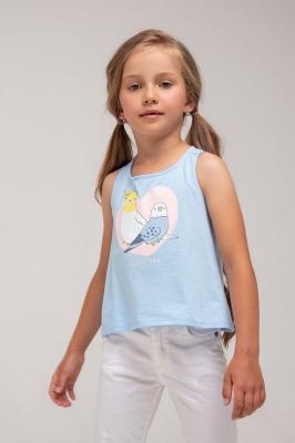 Оригинальная хлопковая майка для девочки на лямках. На груди украшена принтом с попугайчиком. Спинка состоит из двух частей, которые перекрещиваются между собой.Дополнительно