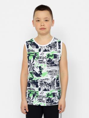 Майка для мальчика из кулирной глади. Горловина и пройма обработана притачной бейкой из рибаны с эластаном. Перед декорирован вязаной нашивкой. Спинка декорирована принтом "Без тормозов".Дополнительно