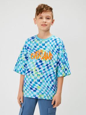 Принтованная трикотажная футболка оверсайз для мальчика. Модель свободной посадки: заметно спущенная линия плеча и прямые рукава, увеличенные по объему и длине. На груди расположен текстовый принт "OVERLAND" англ. - "Сухопутный". Яркая и комфортная футболка сделает образ заметнее и красочнее. Изделие легко комбинируется в образе в стиле хип-хоп с брюками-карго и ярким свитшотом, повязанным вокруг пояса.Дополнительно