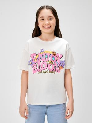 Трикотажная футболка для девочки изготовлена из мягкого и экологичного 100%-ного хлопка. Модель посадки comfort: свободный крой, приспущенная линия плеча, а также увеличенные объем и длина рукава. Спереди расположен яркий принт с надписью "ENJOY THE BLOOM\THE BEST MOOD" англ. - "Наслаждайся цветением|лучшее настроение". Стилизуйте в повседневных образах с широкими джинсами и кедами.Дополнительно