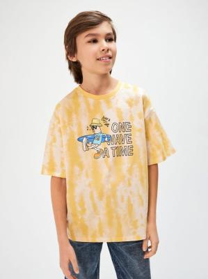Детская футболка для мальчика изготовлена из принтованного трикотажного полотна, обеспечивающего мягкость и комфорт при носке. Модель имеет посадку comfort, что означает свободный крой с приспущенной линией плеча, а также увеличенные объем и длину рукава. Этот стильный крой обеспечивает дополнительное удобство и свободу движений для вашего ребенка. Горловина футболки имеет округлую форму, что придает изделию классический универсальный вид.Спереди размещены яркие принты с надписями "SURF & CHILL" англ. - "Сёрфинг и отдых" и "ONE WAVE A TIME" англ. - "Одна волна за раз", которые добавляют игривости и стиля этой модели, подчеркивая активный образ жизни и любовь к приключениям. Футболка идеально подойдет для повседневного использования, обеспечивая вашему ребенку комфорт и стиль в любой ситуации.Дополнительно