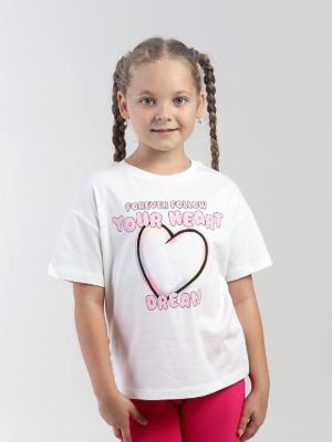 Трикотажная футболка оверсайз для девочки, выполненная из мягкого хлопкового трикотажа. Свободный силуэт с заниженной линией плеча не сковывает движения. Модель дополнена круглым вырезом горловины и короткими рукавами. Горловина оформлена бейкой из кашкорсе. Акцентная деталь в виде яркого трендового принта, в стиле граффити, спереди (надпись: Всегда следую за мечтой твоего сердца).Дополнительно