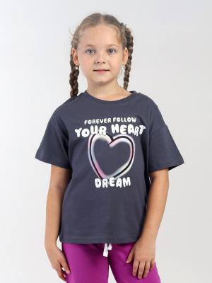 Трикотажная футболка оверсайз для девочки, выполненная из мягкого хлопкового трикотажа. Свободный силуэт с заниженной линией плеча не сковывает движения. Модель дополнена круглым вырезом горловины и короткими рукавами. Горловина оформлена бейкой из кашкорсе. Акцентная деталь в виде яркого трендового принта, в стиле граффити, спереди (надпись: Всегда следую за мечтой твоего сердца).Дополнительно