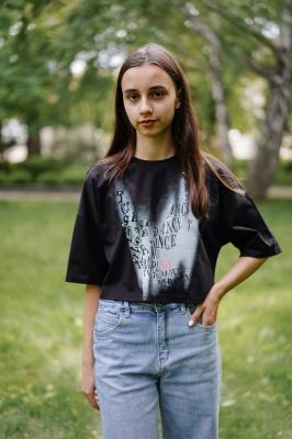 Набивной принт добавляет яркости и индивидуальности, позволяя выразить свой уникальный стиль. Эта футболка идеально подходит для сочетания с джинсами, шортами или юбками, добавляя нотку современности в любой наряд.