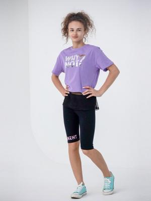 Футболка для девочки свободного силуэта со спущенным плечом, короткими рукавами и отделкой из сетки. Горловина круглая, обработана воротником из полотна с эластаном. Перед футболки декорирован принтом с использованием красок с блеском.Дополнительно