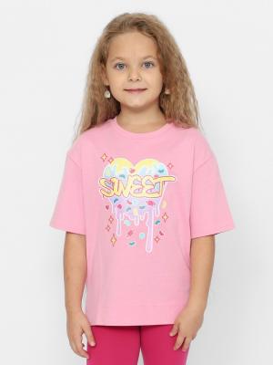 Трикотажная футболка оверсайз для девочки. Свободный силуэт с заниженной линией плеча не сковывает движения. Модель с круглым вырезом горловины и короткими рукавами. Горловина оформлена рельефной резинкой. Снизу в боковых швах разрезы. Перед декорирован ярким принтом с блестящим эффектом (надпись: "Сладкий").Дополнительно