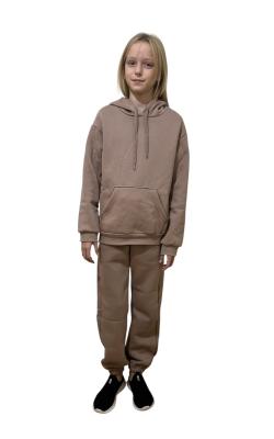 Костюм для девочки с начёсом из футера-трехнитки. Состоит из толстовки с капюшоном со шнурком, карман-кенгуру. Манжеты и пояс из эластичной рибаны. На рукаве декоративная силиконовая нашивка, и брюк с карманами в швах. Пояс с функциональным шнурком, внизу на резинке.Дополнительно