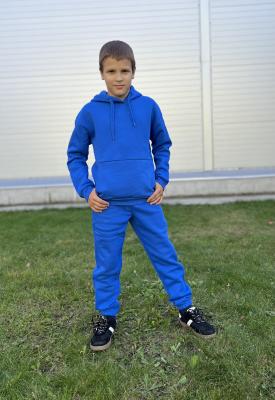 Костюм для мальчика с начёсом из футера-трехнитки. Состоит из толстовки с капюшоном со шнурком, карман-кенгуру. Манжеты и пояс из эластичной рибаны. На рукаве декоративная силиконовая нашивка, и брюк с карманами в швах. Пояс с функциональным шнурком, внизу на резинке.Дополнительно