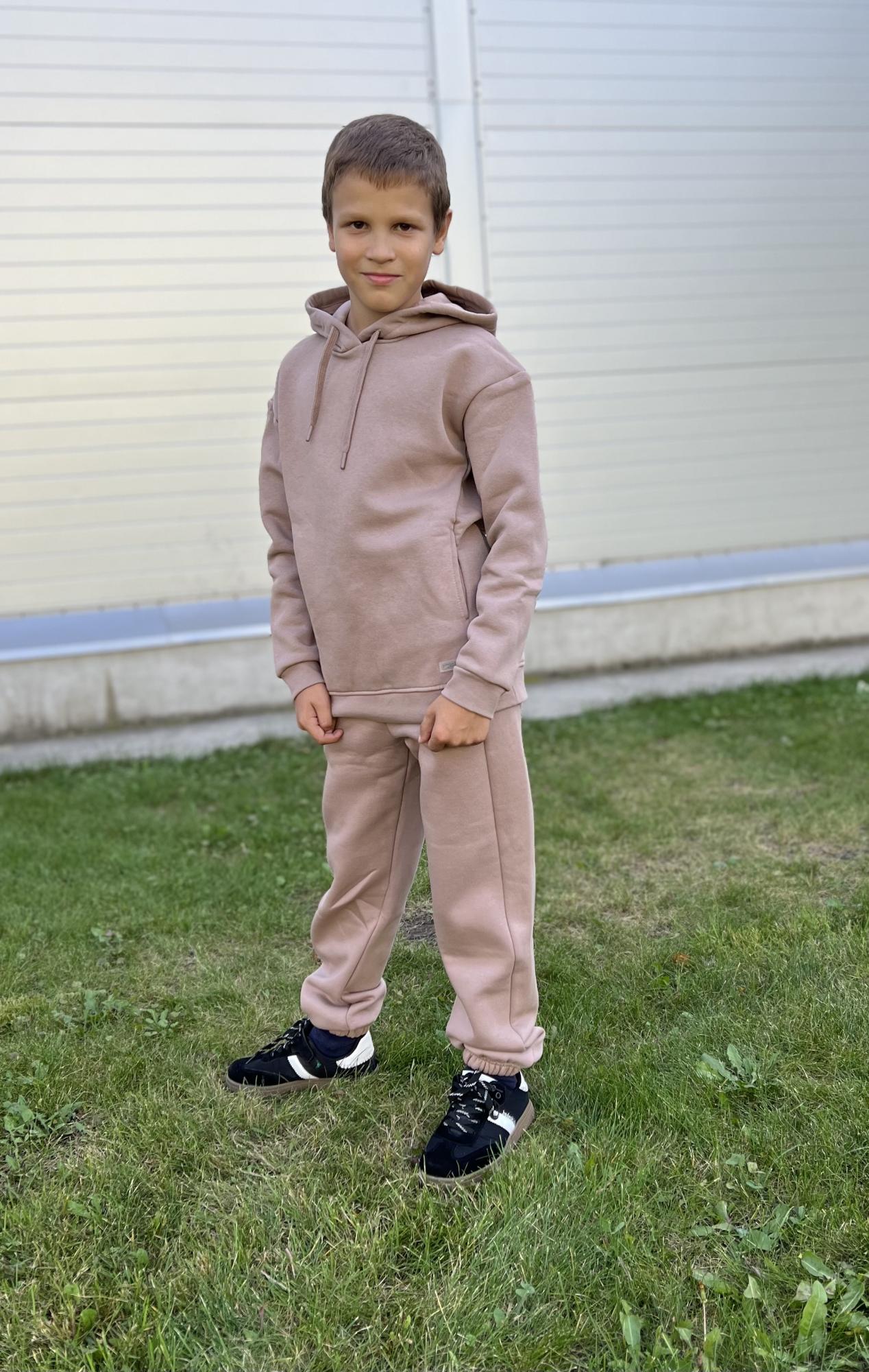 Костюм для мальчика с начёсом из футера-трехнитки. Состоит из толстовки с капюшоном со шнурком, карман-кенгуру. Манжеты и пояс из эластичной рибаны. На рукаве декоративная силиконовая нашивка, и брюк с карманами в швах. Пояс с функциональным шнурком, внизу на резинке.Дополнительно