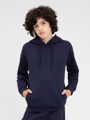 Костюм для мальчика с начёсом из футера-трехнитки. Состоит из толстовки с капюшоном со шнурком, карман-кенгуру. Манжеты и пояс из эластичной рибаны. На рукаве декоративная силиконовая нашивка, и брюк с карманами в швах. Пояс с функциональным шнурком, внизу на резинке.Дополнительно
