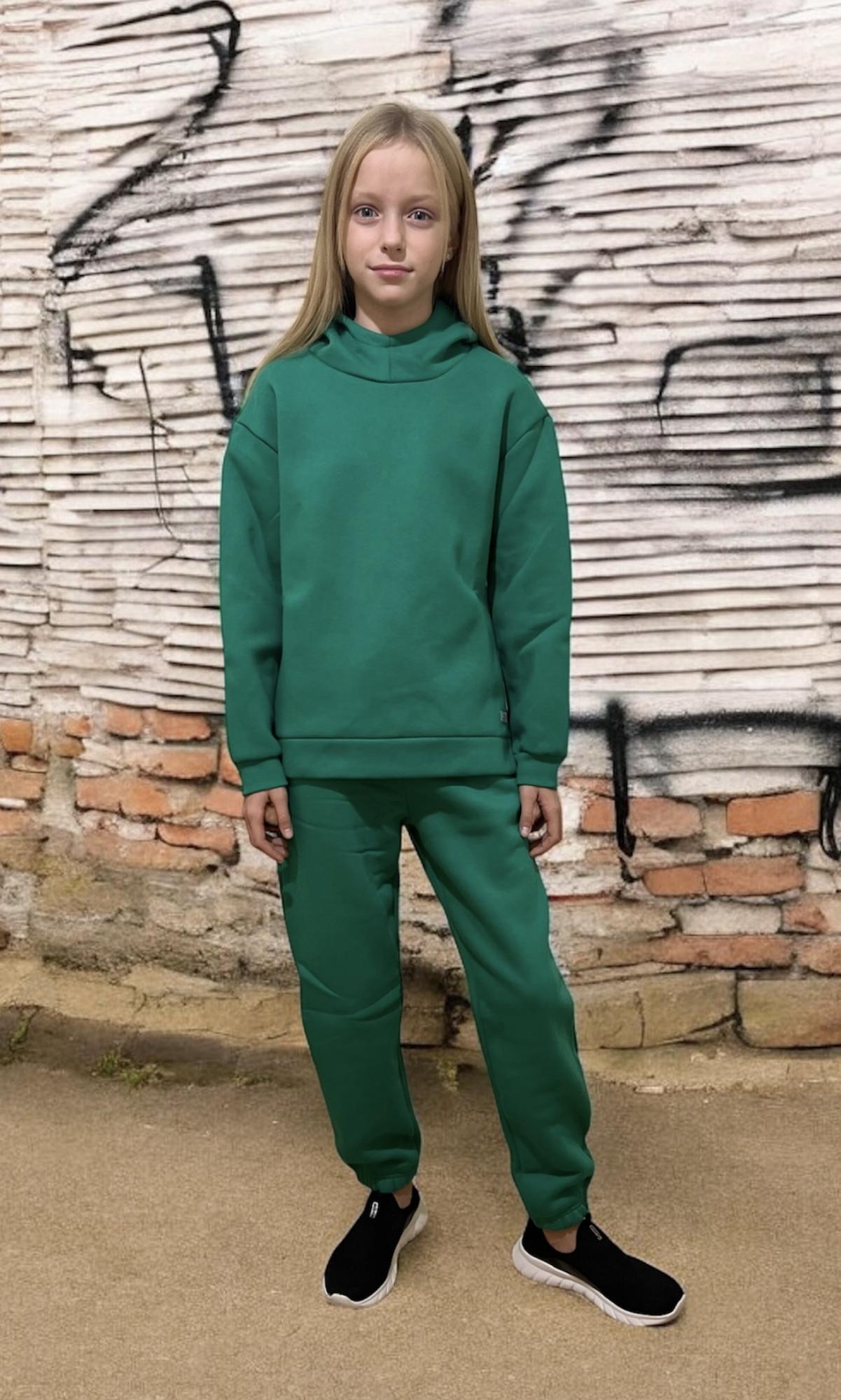 Костюм для девочки с начёсом из футера-трехнитки. Состоит из толстовки с капюшоном со шнурком, карман-кенгуру. Манжеты и пояс из эластичной рибаны. На рукаве декоративная силиконовая нашивка, и брюк с карманами в швах. Пояс с функциональным шнурком, внизу на резинке.Дополнительно