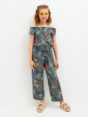 Комбинезон свободного кроя с дизайнерским цветочным принтом для девочек. Сшит из жатой вискозы - легкого, воздухопроницаемого и приятного к телу материала. Эластичная талия с декоративным шнурком. Горловина собрана на резинки. Цельнокроеные рукава с кокеткой. Без застежек.Дополнительно