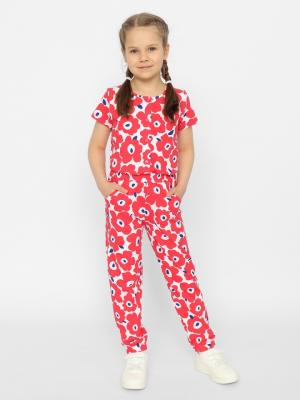 Комбинезон для девочки из набивной кулирки, с резинкой по талии и боковыми карманами. Верхняя часть комбинезона с короткими рукавами. Горловина обработана окантовочной бейкой из кулирки. Спереди застежка на пуговицы. Снизу брюк резинки.Дополнительно