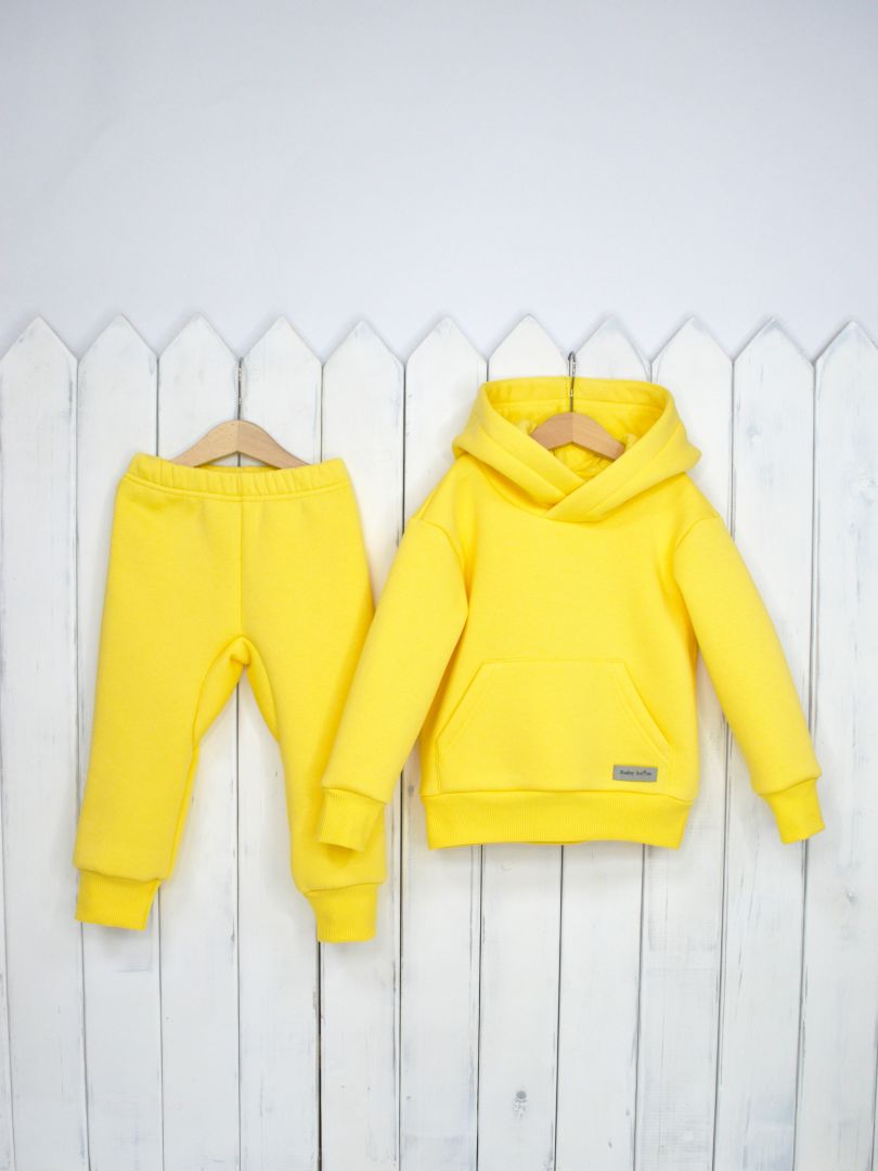 Комплект из однотонного футера 3-нитки с начесом (80% хлопок, 20% п/э). В комплект входит курточка с карманами кенгуру и капюшоном, и брюки.Дополнительно